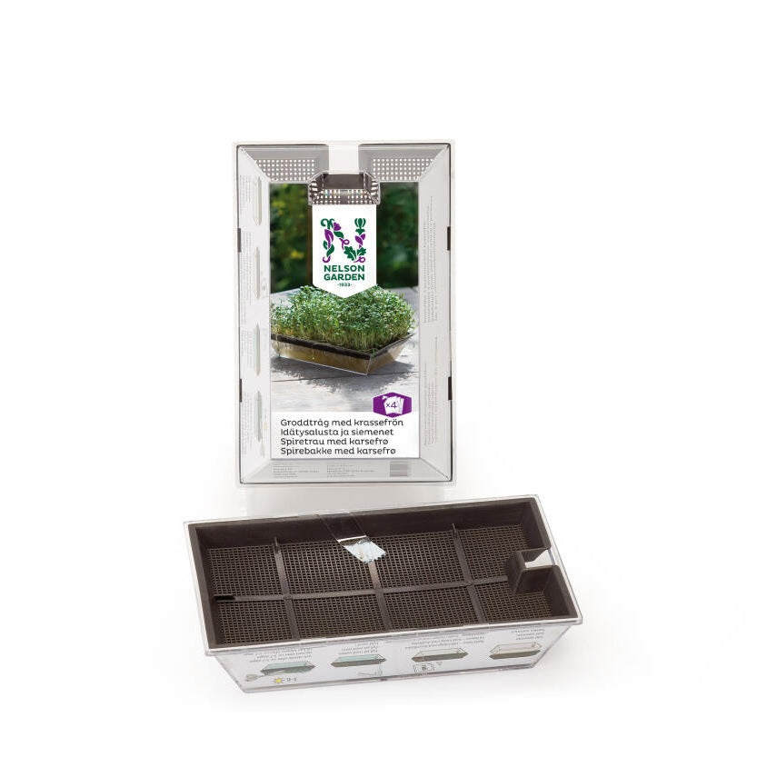 Odlingskit med groddtråg och krassefrön. Med hjälp av groddtråget är det enkelt att grodda/odla skott av olika sorters fröer. Detta lilla groddtråg är speciellt lämpligt för små frön; krassefrön medföljer i förpackningen. Då fröna gror bildas mängder av nyttiga vitaminer och mineraler. Grodda/odla skott på varm plats, 20-25 °C. Groddarna/skotten är färdiga efter 5-10 dagar. Mått: 10 x 15,5 cm.