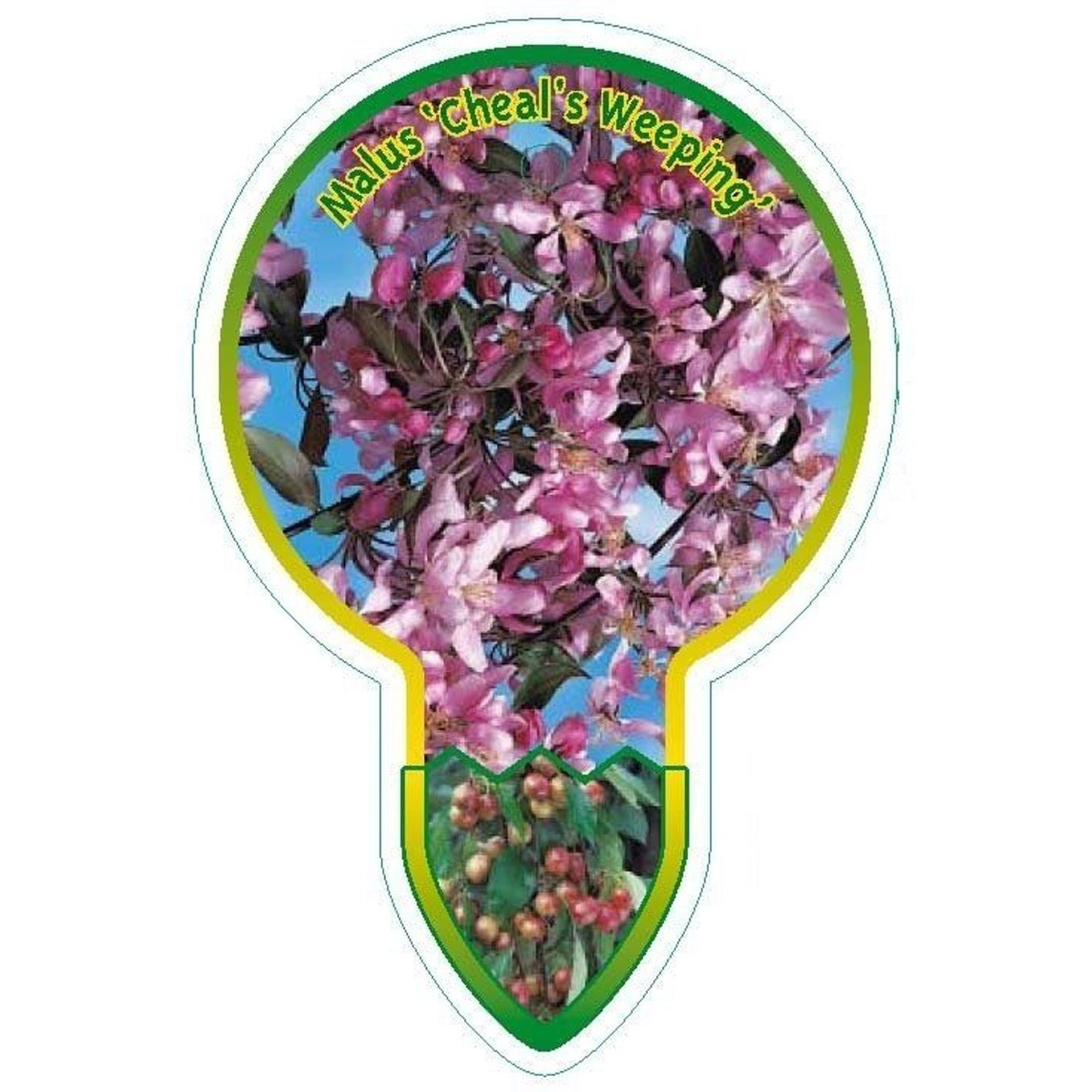 Malus 'Cheal's Weeping' är en prydnadsapel med elegant hängande grenar och en kompakt växtform som passar utmärkt som solitärbuske eller i mindre trädgårdar. Den blommar i vår med vita till rosaaktiga blommor och utvecklar vackra, små äpplen som bidrar till trädets visuella attraktion. Växten är frostresistent och kräver minimal skötsel, vilket gör den till ett praktiskt val för flera olika typer av trädgårdslandskap.