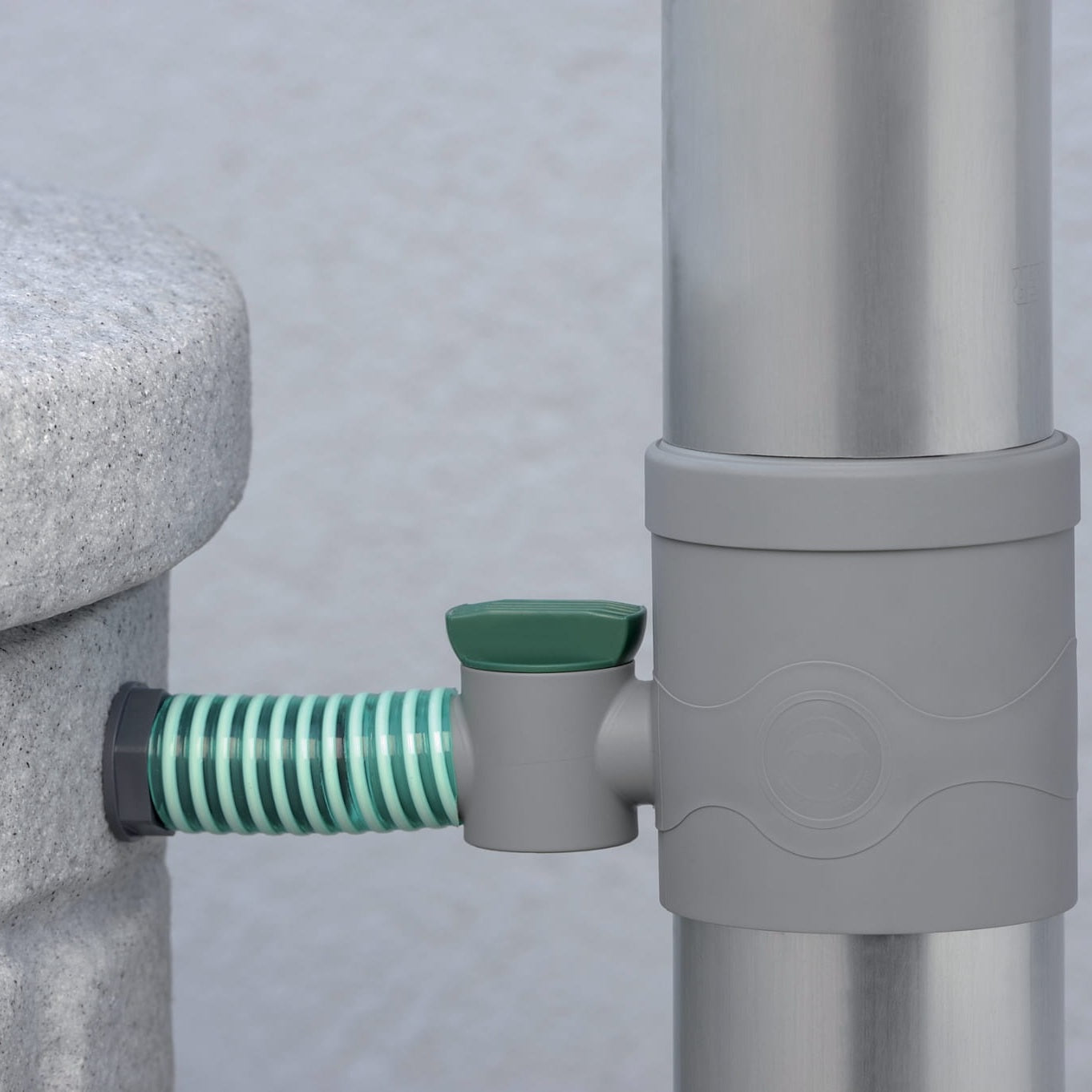 Samlaren med ventil (grå) för montering på rännan