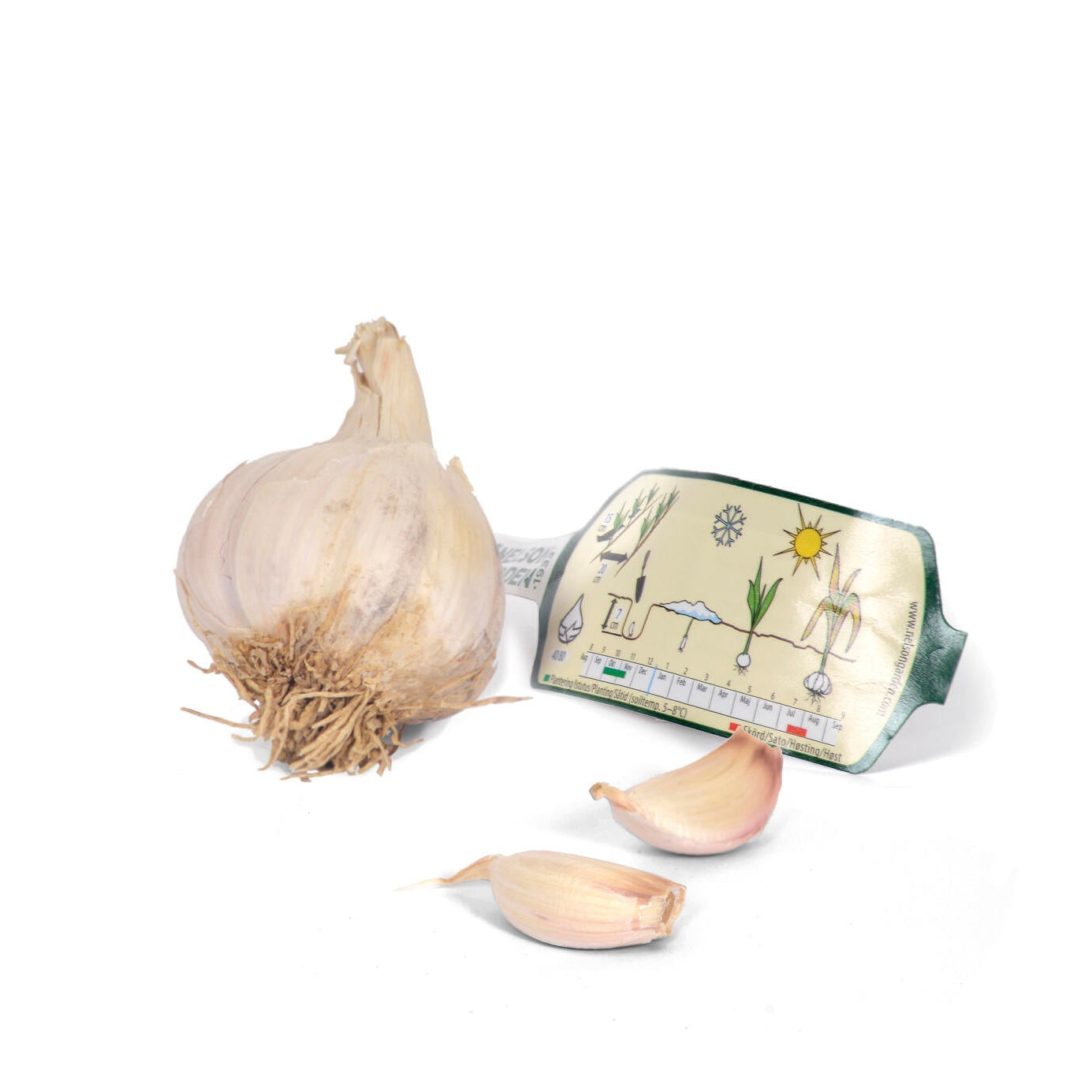 Sort som skördas i juli, tänk på att klippa ner stängeln ca 2 veckor innan vitlöken skördas. Ger cirka 12 vackert rosa klyftor inuti den vita löken. Hardneck